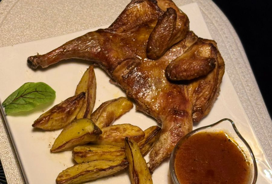 Цыпленок корнишон, картофель по-деревенски, красный соус