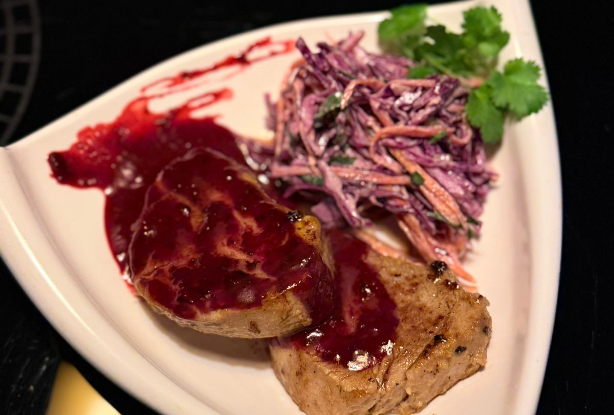 Свиная вырезка, салат коул слоу, брусничный соус